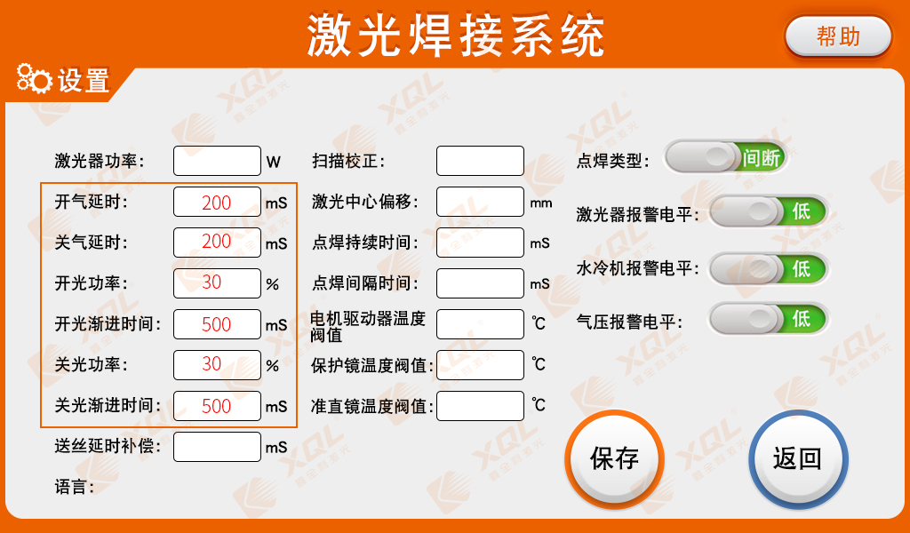 ③設(shè)置參數(shù)盡量給予緩升緩降,如開/關(guān)氣延時(shí)200-500ms,開/關(guān)光功率20%,開/關(guān)光漸進(jìn)時(shí)間200-300ms,如圖不可設(shè)0