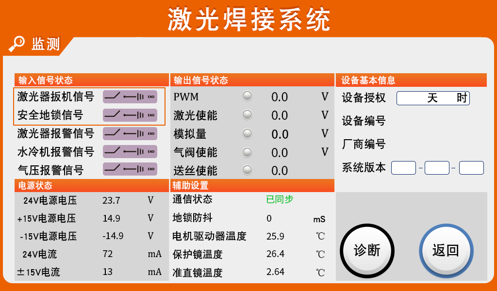 按照其運(yùn)行邏輯,只有【激光器扳機(jī)信號(hào)】和【安全地鎖信號(hào)】有效時(shí),才會(huì)出光(激光器狀態(tài)正常),同時(shí)首頁(yè)未出現(xiàn)任何報(bào)警