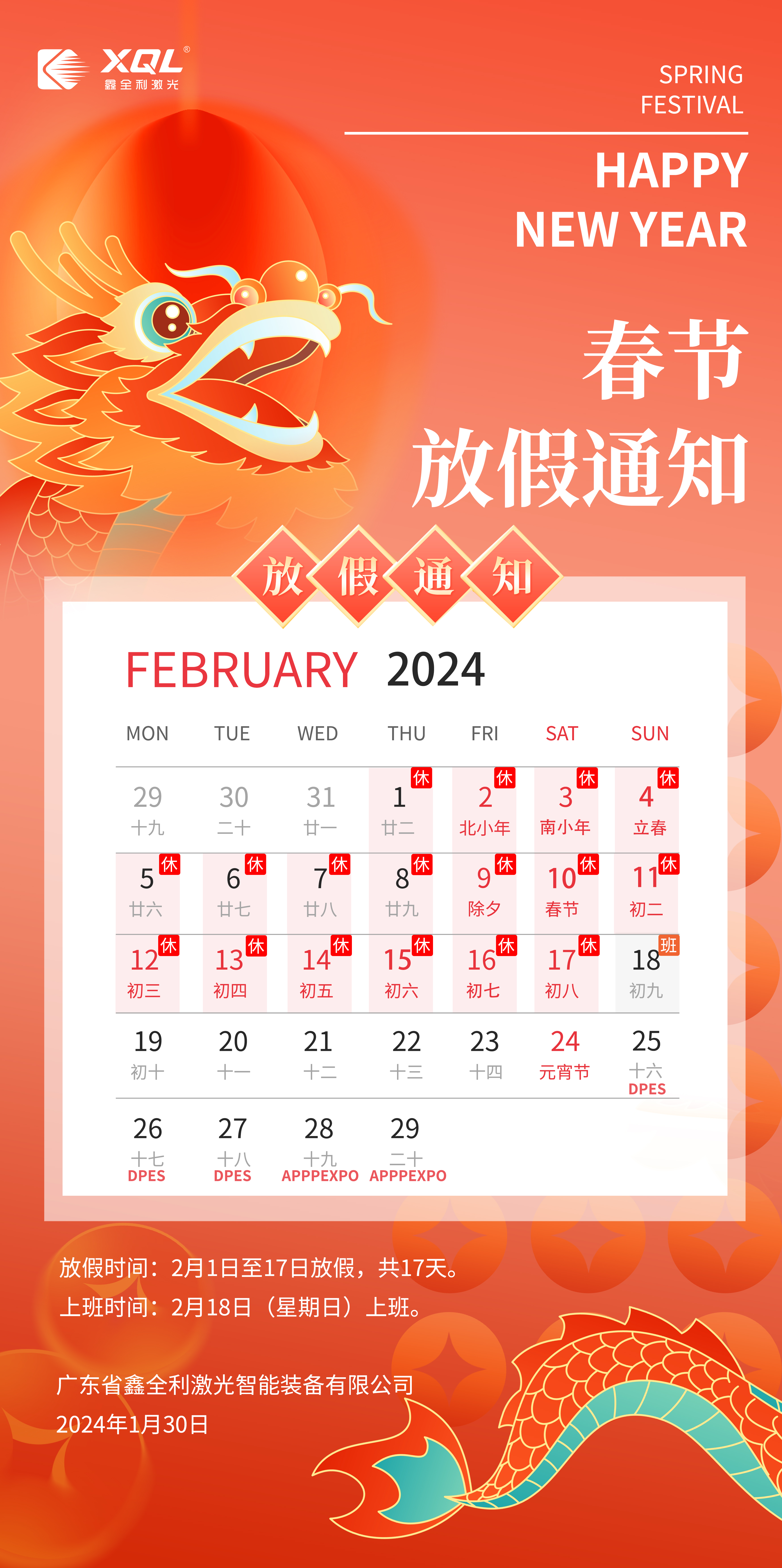 在2024年春節(jié)長(zhǎng)假到來之際,感謝大家一如既往的支持和厚愛,在此,鑫全利激光及全體員工衷心祝愿每一位合作伙伴/客戶,在新的一年里,身體健康、生意興隆、家庭幸福!