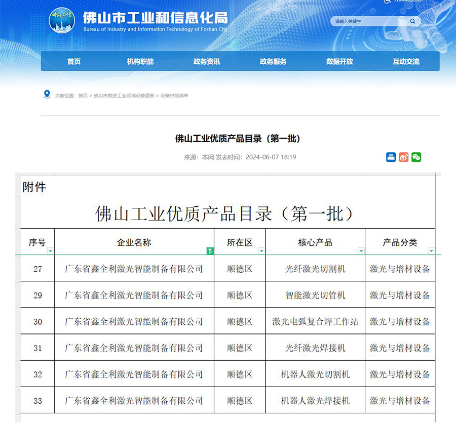 經(jīng)嚴格篩選,市工業(yè)和信息化局最終確定佛山工業(yè)優(yōu)質(zhì)產(chǎn)品目錄(第一批)其中,我司(廣東省鑫全利激光智能裝備有限公司)旗下的“激光切割機、激光焊接機、機器人自動化等系列的產(chǎn)品成功入選,這一重要的行業(yè)認可名單,匯聚了全市范圍內(nèi)眾多創(chuàng)新性強、技術(shù)先進、品質(zhì)卓越的工業(yè)產(chǎn)品和技術(shù)。