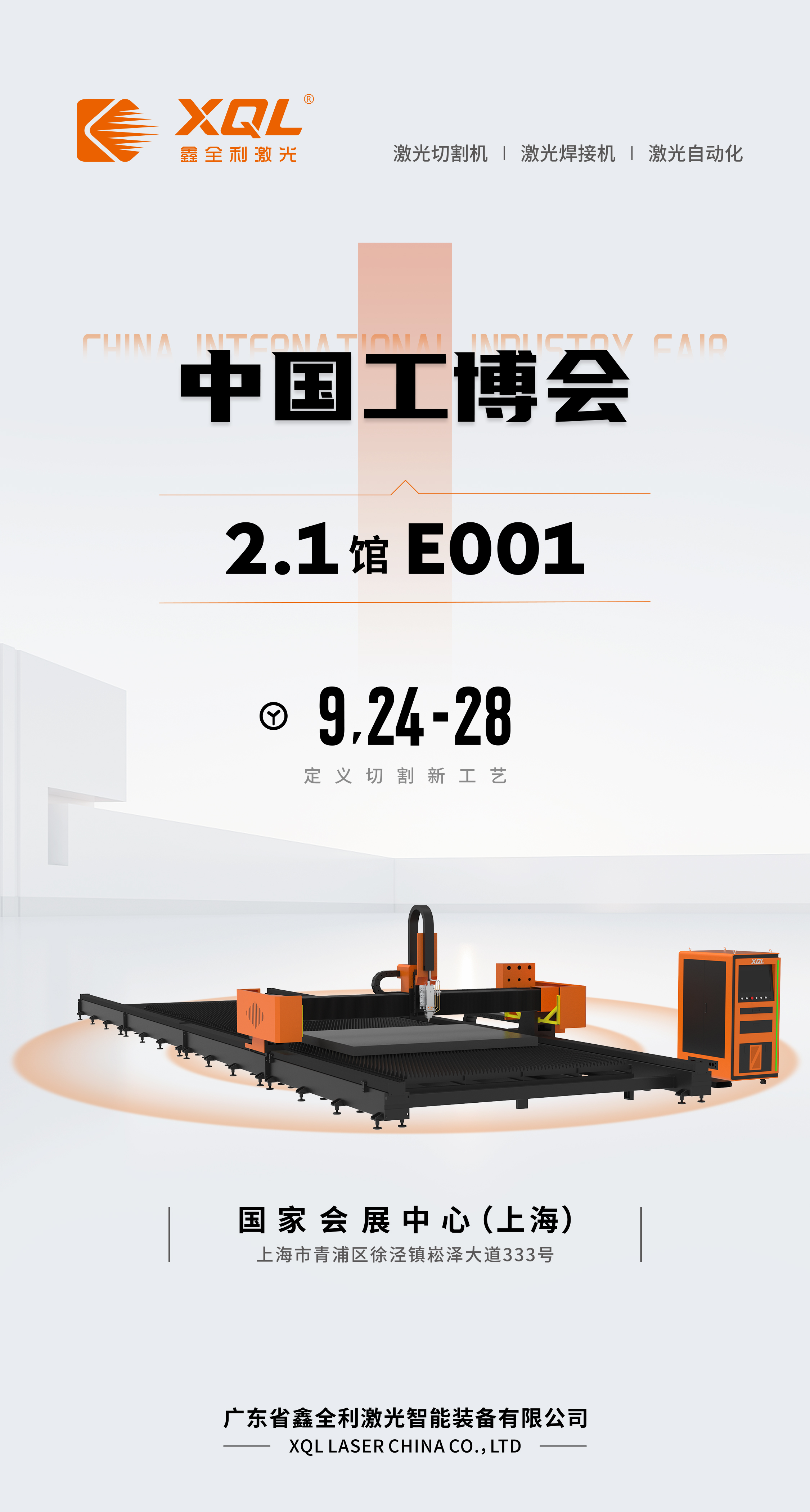 9月24-28日,中國工博會(huì)(全稱:第二十四屆中國國際工業(yè)博覽會(huì))在國家會(huì)展中心(上海)隆重啟幕。鑫全利激光誠邀您的到來!