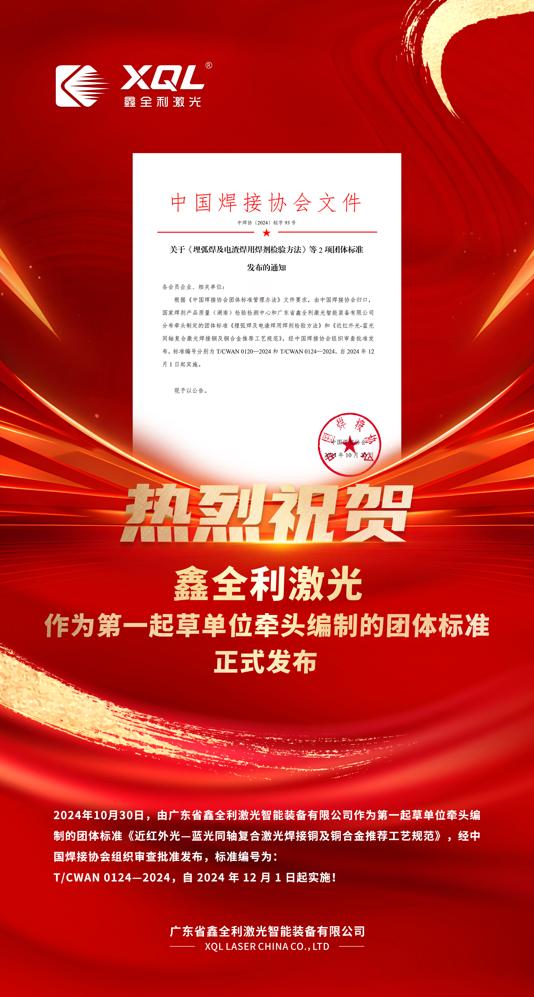 重磅!鑫全利激光牽頭制定的《近紅外光—藍光同軸復合激光焊接銅及銅合金推薦工藝規(guī)范》團體標準發(fā)布!