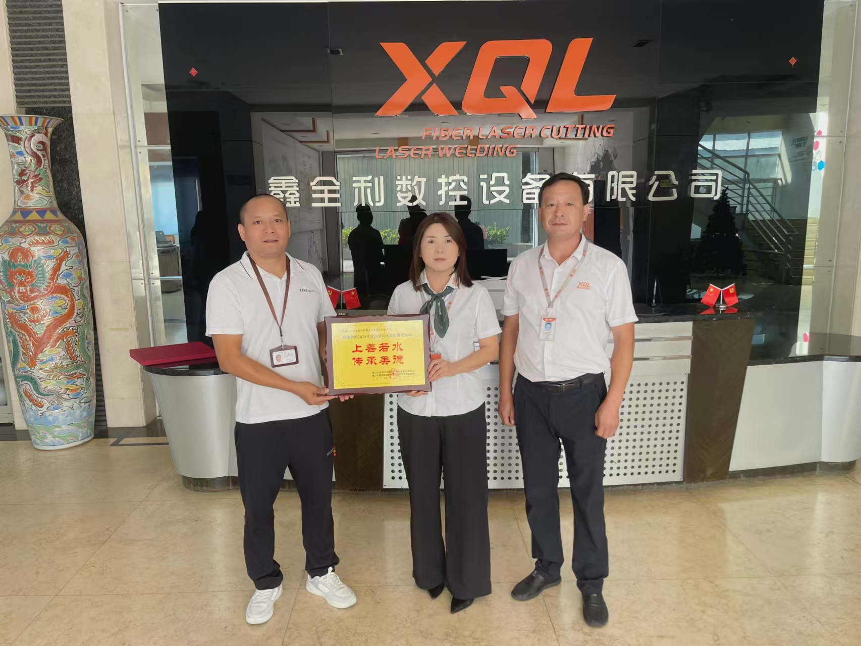 容桂高黎社區(qū)的工作人員為鑫全利激光頒發(fā)“上善若水,傳承美德”牌匾。這是對(duì)鑫全利激光熱心慈善、積極踐行公益事業(yè)的肯定與激勵(lì)。