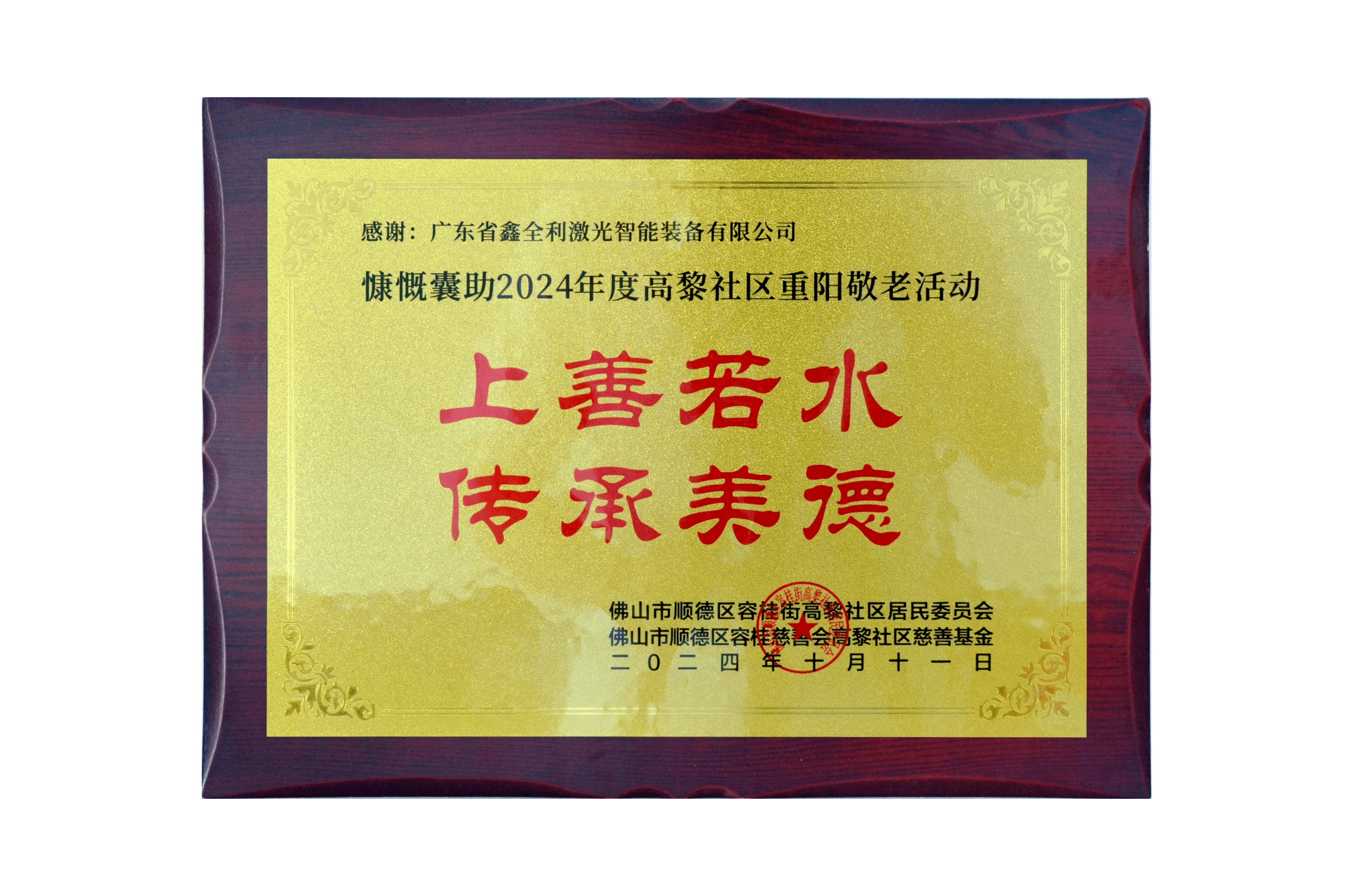 鑫全利激光捐助容桂高黎社區(qū)重陽敬老活動(dòng)并獲贈(zèng)牌匾!