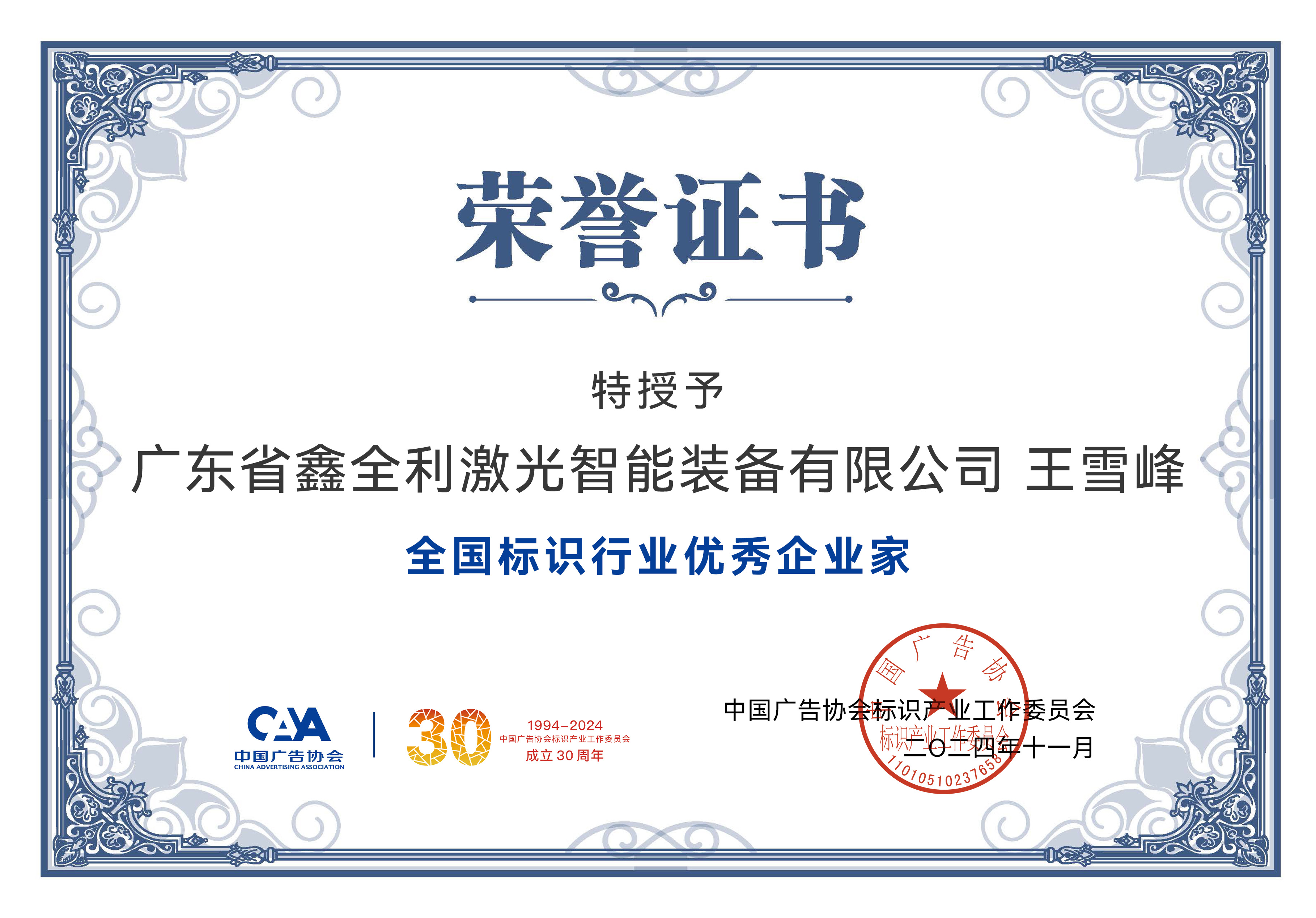 2024 年 11月 ,我司董事長(zhǎng)王雪峰先生憑借其卓越的領(lǐng)導(dǎo)才能和對(duì)廣告標(biāo)識(shí)行業(yè)發(fā)展的杰出貢獻(xiàn),被中國(guó)廣告協(xié)會(huì)標(biāo)識(shí)產(chǎn)業(yè)工作委員會(huì)授予“全國(guó)標(biāo)識(shí)行業(yè)優(yōu)秀企業(yè)家”稱號(hào),為公司的發(fā)展,書寫新篇章。