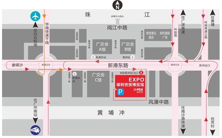b、廣州南站:2號線→昌崗(轉(zhuǎn)8號線)→琶洲站C/D出口