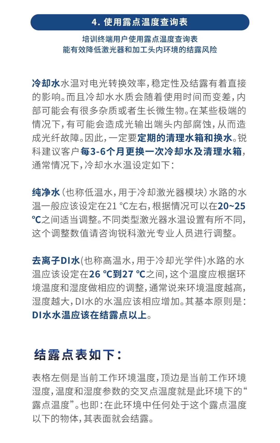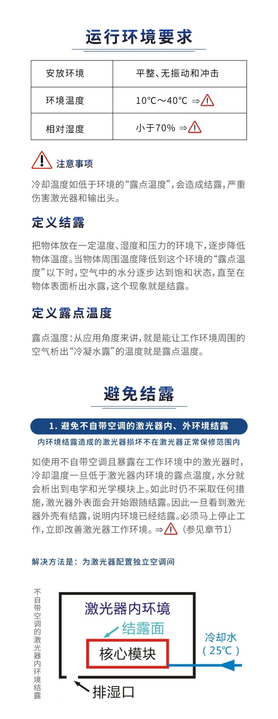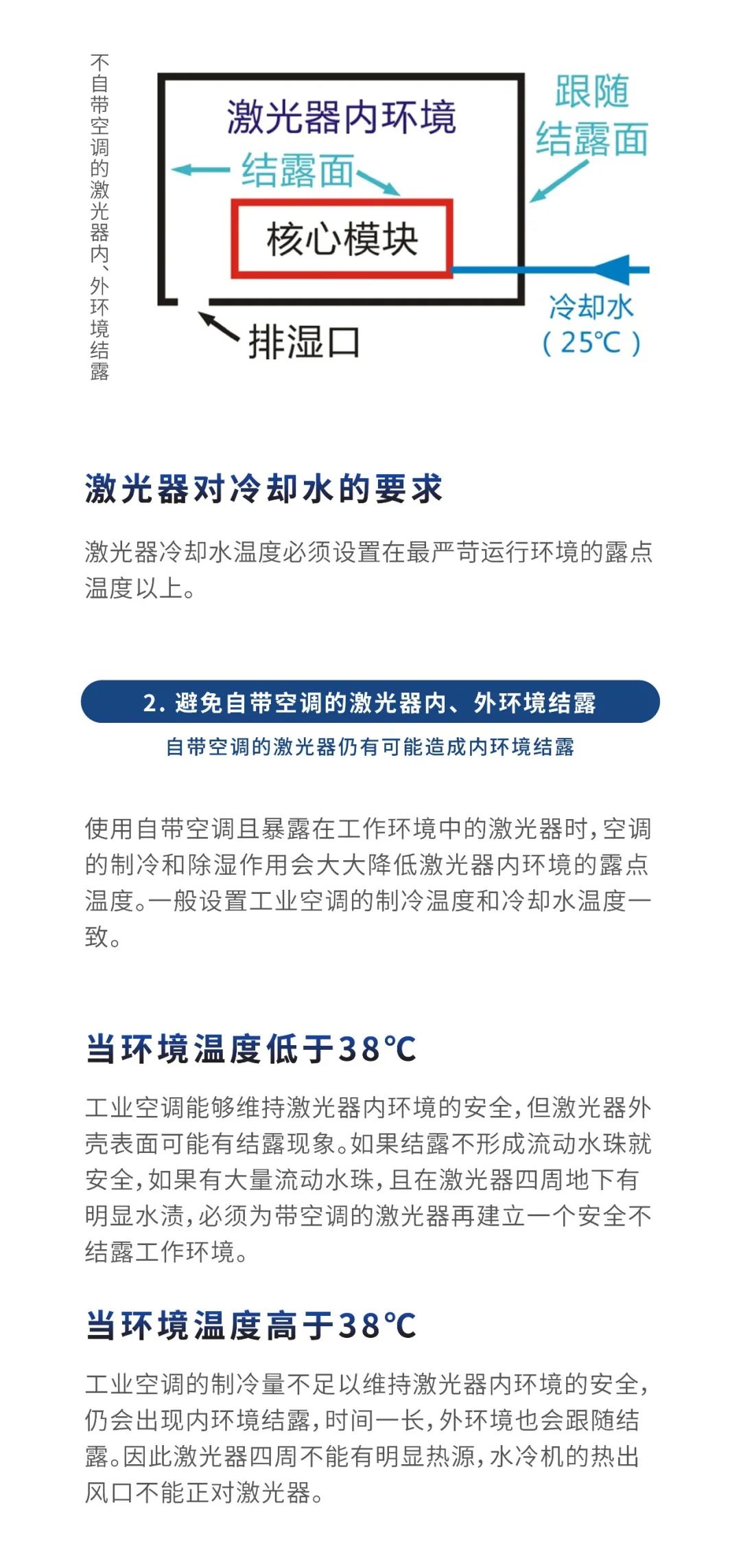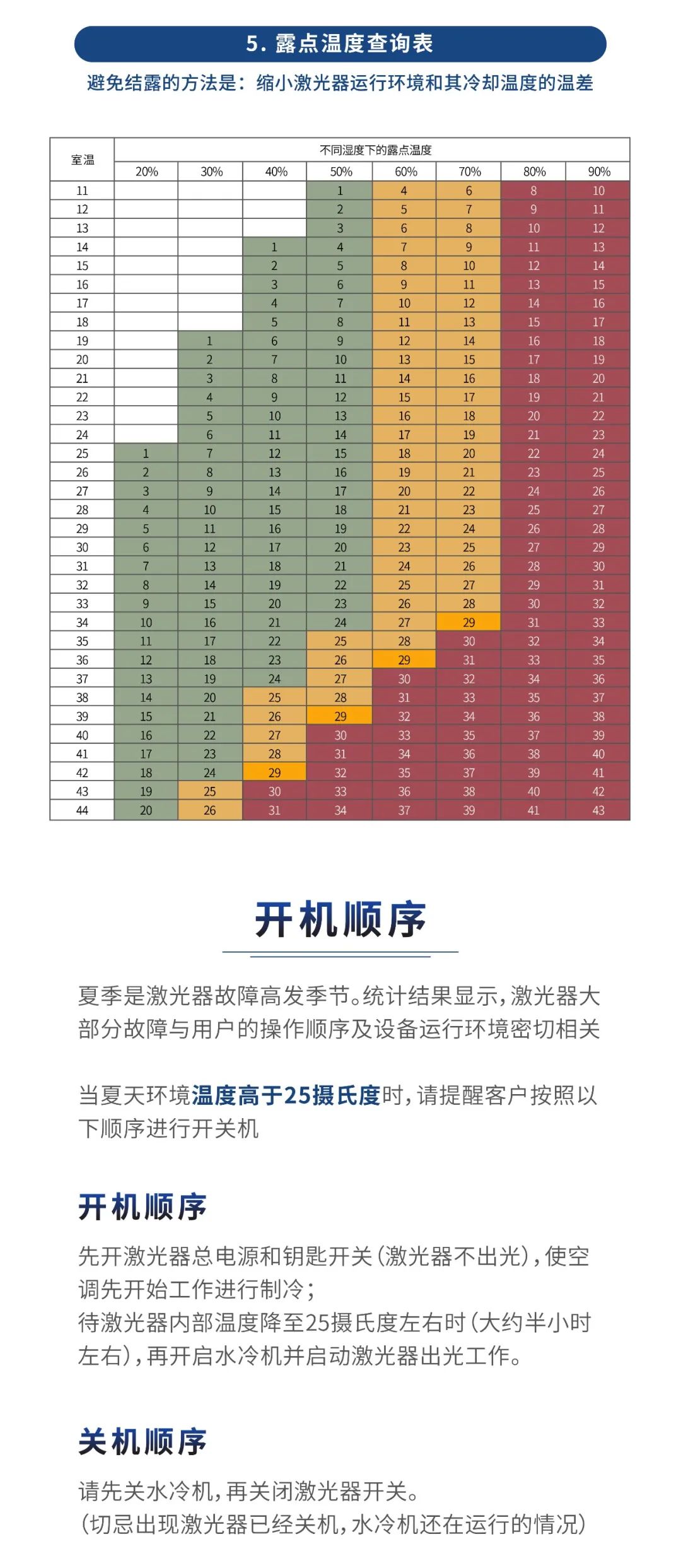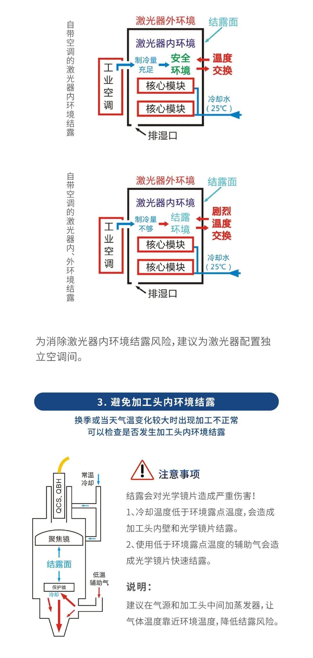 激光器和切割頭為激光切割機(jī)的重要光學(xué)組成部分,夏季結(jié)露問(wèn)題輕則出現(xiàn)報(bào)警無(wú)法正常切割需等待濕度下降解除報(bào)警。重則燒壞電氣元件或光學(xué)元件造成重大損失。