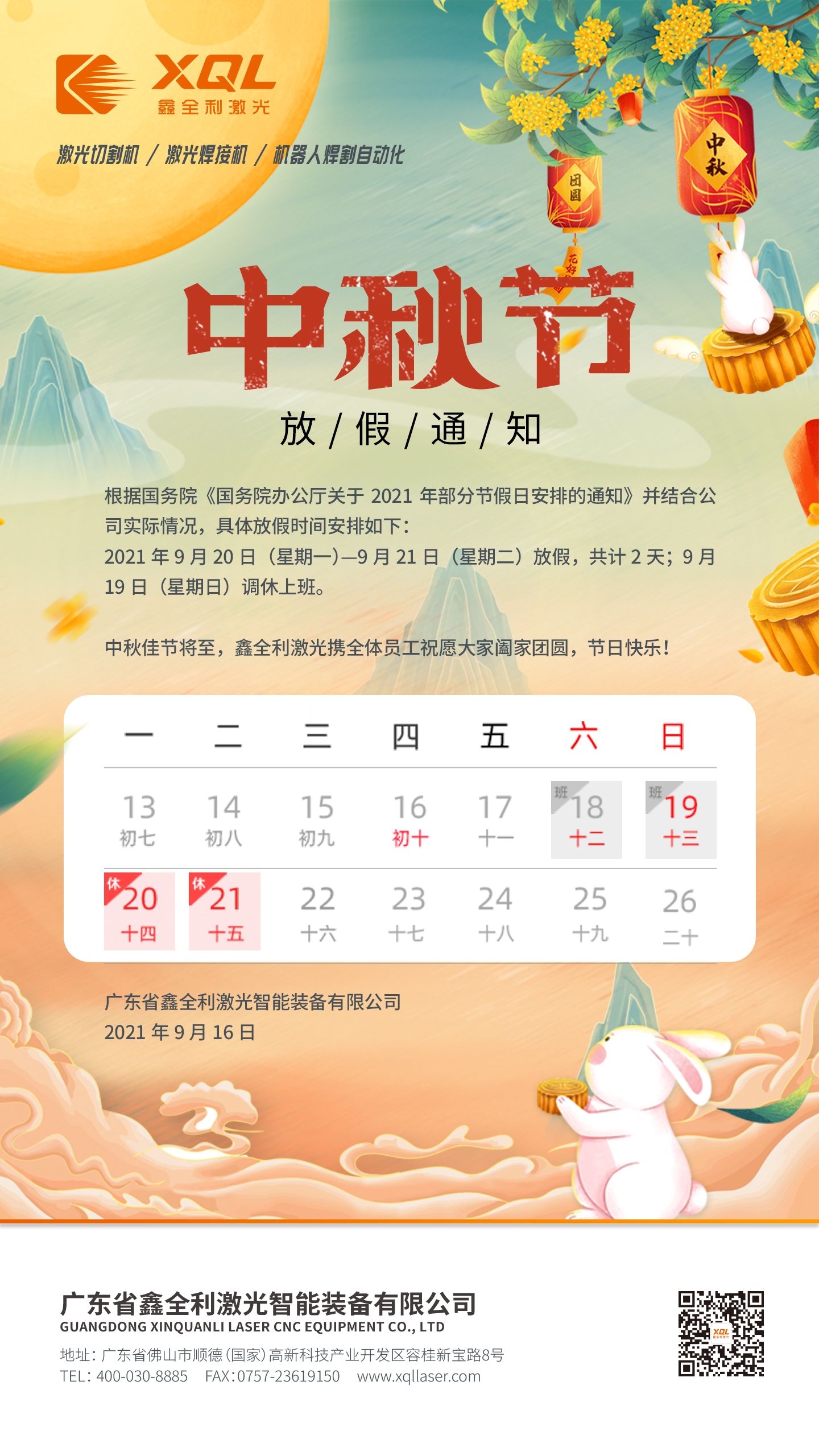 鑫全利激光中秋放假通知:9月20日(星期一)—9月21日(星期二)放假,共計2天; 9月19日(星期日)調(diào)休上班。放假期間暫停發(fā)貨,請廣大客戶提前做好備貨計劃,給您帶來不便,敬請諒解!