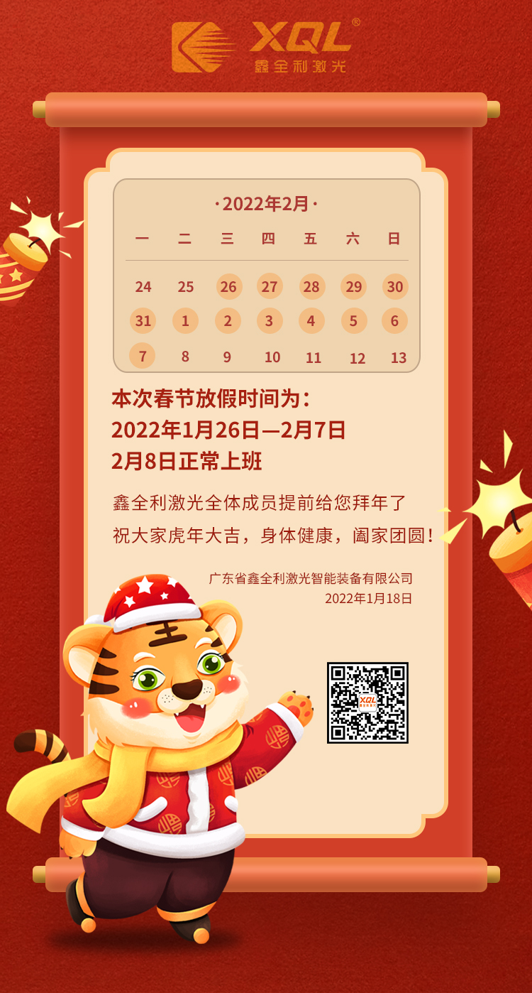 【鑫全利激光春節(jié)放假通知】2022年1月26日-2月7日放假,2月8日正常上班。春節(jié)將至,放假日期已定,正值銷售高峰,請(qǐng)各位老板提前做好備貨計(jì)劃!在此鑫全利激光全體員工提前祝您及家人:新春快樂(lè)!萬(wàn)事如意!生意興??!