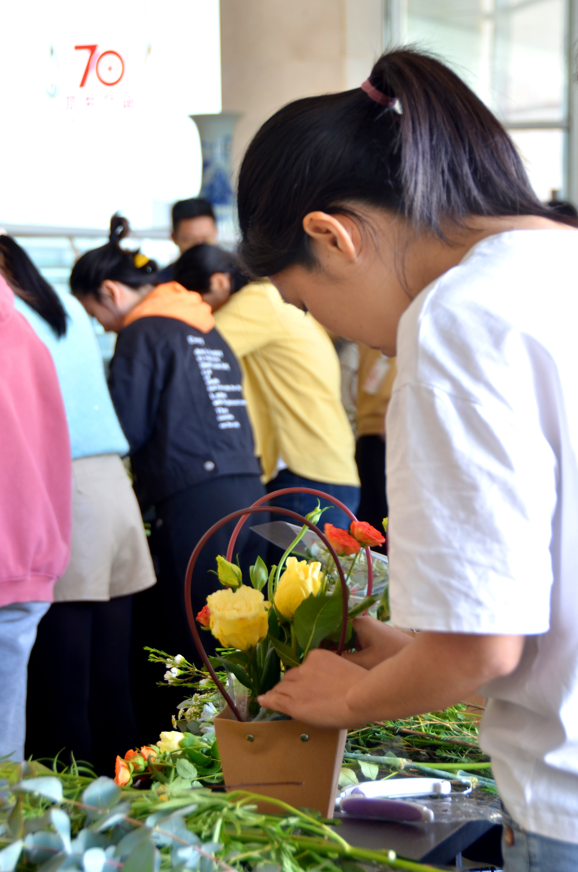 花藝插花活動中,花藝?yán)蠋煆倪x花、裁剪、顏色搭配、造型、花語等多方面進行講解。心動不如行動,聽完花藝?yán)蠋煹慕榻B,大家都興奮不已,躍躍欲試。修剪花枝、構(gòu)思設(shè)計、搭配色彩,把自己的創(chuàng)意和想法通過一朵朵鮮花呈現(xiàn)出來,在設(shè)計的過程中彼此之間相互討論交流想法,在大家的精心修剪創(chuàng)作下,一件件賞心悅目、鮮活精致的作品呈現(xiàn)在大家面前?;顒蝇F(xiàn)場花香四溢、滿室芬芳,大家與花相伴,盡情享受了創(chuàng)作的愉悅和藝術(shù)的熏陶。