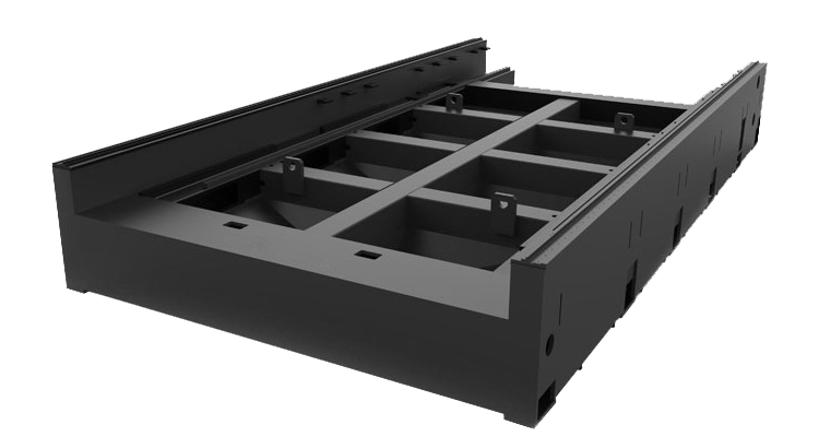 機(jī)加工時(shí)使用數(shù)控龍門(mén)銑床,一次性加工床身兩側(cè)的導(dǎo)軌和齒條安裝面,保證了機(jī)架兩側(cè)導(dǎo)軌、齒條安裝面精度的一致性。